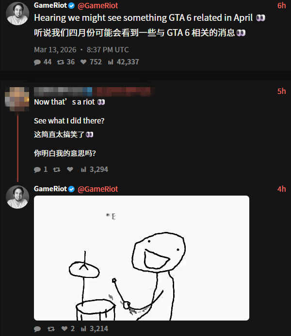 油管爆料博主@GameRiot也在个人社交平台给出了暗示,明确表示“4月份将会有《GTA6》的相关消息”,同时他还特意澄清,此次消息与游戏跳票无关,打消了部分玩家的顾虑。要知道,《GTA6》曾经历两次延期,从2025年假期档推迟至2026年5月,后又再度延后至11月19日,粉丝们对跳票消息格外敏感。