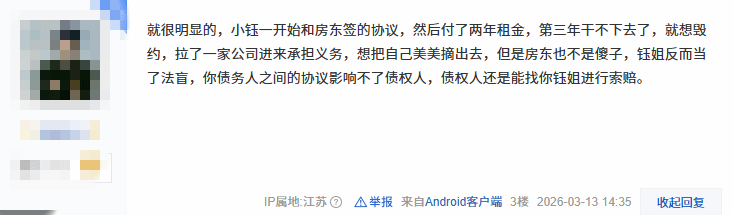 有网友爆料称:“小钰一开始是和房东签的店铺租赁协议,还支付了两年租金,到第三年经营不下去,就想毁约脱身,拉了一家公司进来承担相关义务,想把自己摘干净。但房东也不是傻子,要知道,债务人之间私下达成的协议,是影响不到债权人的,债权人依然可以向小钰索赔。”