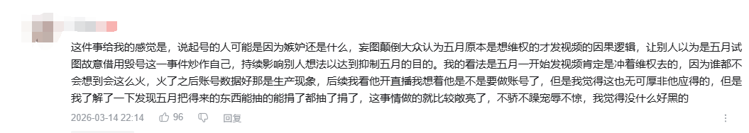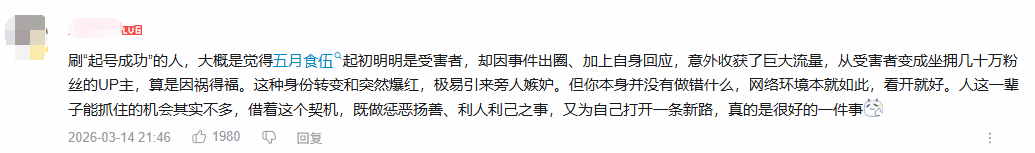 “五月食伍”在视频中还透露,事发前他一直以为主播口中的“毁号”仅是直播效果或玩笑话,直到自己亲身遭遇才意识到对方是动真格的。这起事件不仅引发了关于主播行为边界的讨论,也让公众开始反思:受害者因曝光度增加而涨粉,是否就理应受到“二次审判”?在网络舆论场中,对受害者的动机进行过度揣测,究竟是一种必要的监督,还是一种新的不公?