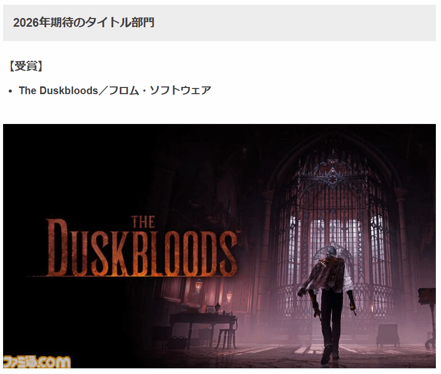 From Software(简称FS社)此前公布的新作《The Duskbloods》(本文暂译《黄昏之血》)传来新动态,这款备受关注的作品在日本知名媒体Fami通举办的“电击游戏大奖”中,成功斩获“最受期待游戏”称号,进一步点燃了玩家们的期待值。