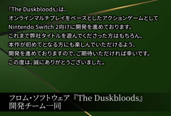 针对此次获奖,FS社也正式发表感言,明确透露了这款新作的核心信息:《黄昏之血》定位为在线多人动作游戏,目前正全力针对Nintendo Switch 2(简称NS2)平台推进开发工作。FS社在感言中表示,为了让长期支持自家作品的老玩家,以及首次接触该系列的新玩家都能获得良好体验,团队正全力以赴打磨游戏,期待未来能给大家带来惊喜,并向所有支持他们的玩家表达了诚挚的感谢。