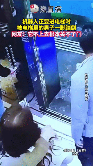 从监控画面中能看到,这台物业服务机器人正按照预设程序,缓缓靠近电梯口,准备进入电梯开展工作。就在此时,电梯内的男子毫无征兆地抬起脚,猛地将机器人踹翻在地,机器人瞬间失去平衡,仰倒在电梯口,无法正常运行。