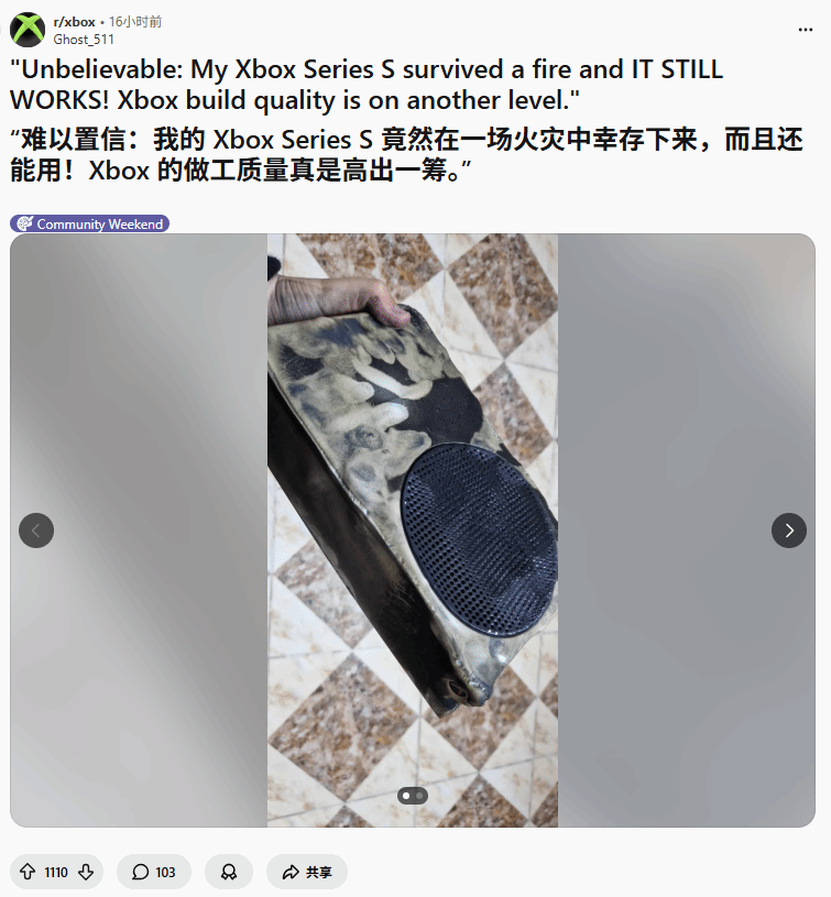 近日,Reddit论坛上一位玩家分享了一件令人意外的事:自己家中遭遇火灾,房屋受损严重,但他的Xbox Series S主机却成功幸存,更令人惊讶的是,事后这台主机依旧能正常启动、正常游玩。