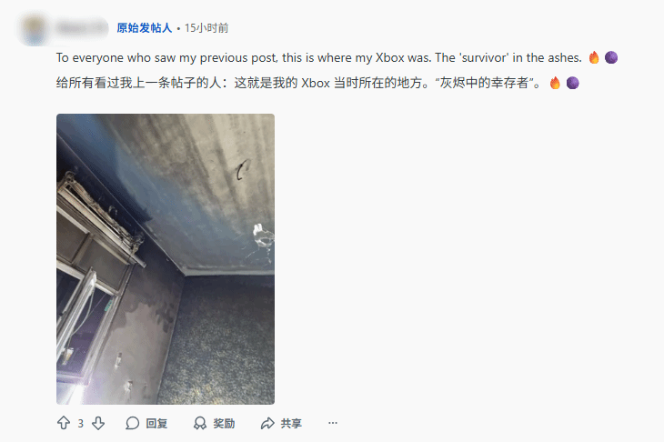 面对网友的质疑,发帖玩家也晒出了家中失火后的现场照片,从照片中能清晰看到,整间屋子从天花板到地板都被烟火熏得漆黑一片,火势的猛烈程度可见一斑,也从侧面印证了Xbox主机幸存的不易。