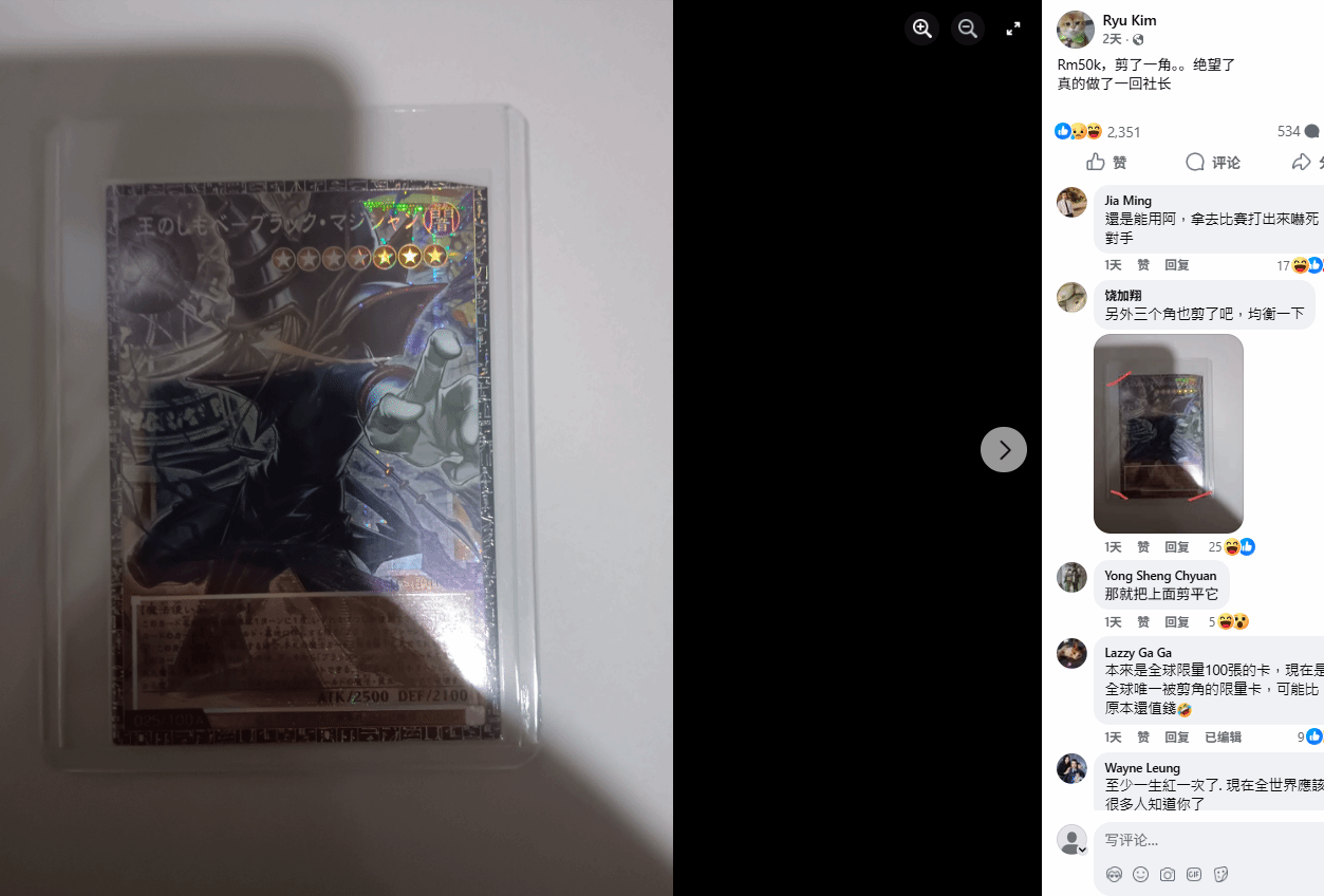 一段流传于网络的影片,让一名马来西亚《游戏王》玩家意外走红,只不过这份“走红”背后,是难以承受的损失——他在拆卡时不慎用剪刀剪坏了一张市价约25万元人民币的限量收藏卡,原本的天价藏品瞬间大幅贬值,当事人当场陷入崩溃。这段影片于3月13日开始在网络上传播,引发了网友们的广泛讨论。