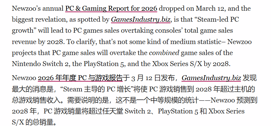 知名游戏分析机构Newzoo发布了2026年PC与主机游戏市场专项报告,其中一项预测引发行业关注:在Steam平台的强力推动下,到2028年,PC平台游戏买断制销售的总收入,将全面超过任天堂Switch 2、PS5、Xbox Series X/S三大主机平台的买断制收入总和(该统计数据不含各平台订阅制服务收入)。