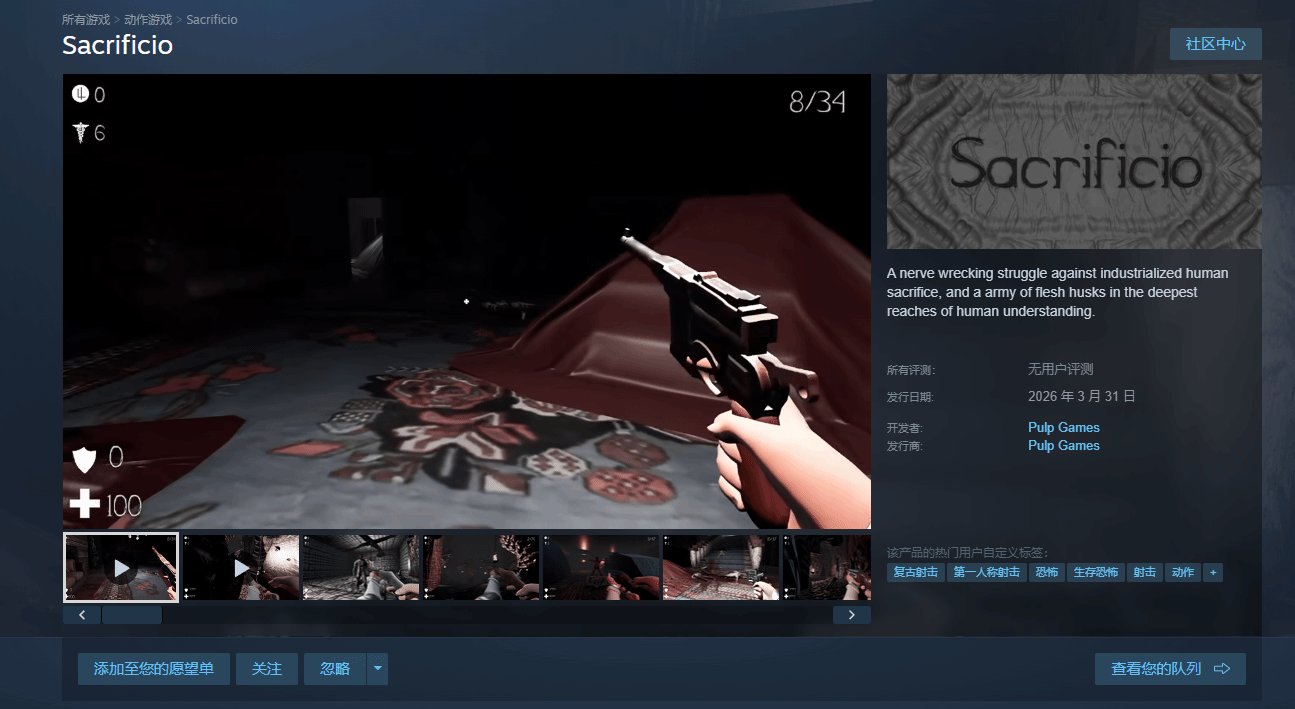 外媒gamerant消息显示,Pulp Games打造的复古第一人称射击游戏《Sacrificio》已确定上线时间,将于2026年3月31日正式登陆Steam平台,目前该游戏的免费试玩Demo已对外开放,玩家可提前体验其核心玩法。