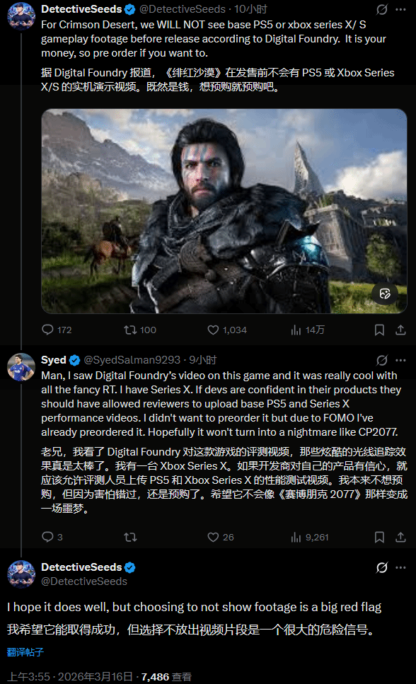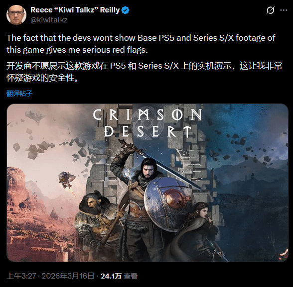 由韩国Pearl Abyss工作室开发的开放世界动作冒险游戏《红色沙漠》,即将于3月20日正式登陆PC、PS5及XSX平台,然而在发售前夕,这款备受关注的作品却迎来了不少争议,多位知名游戏业内人士接连发出警告,暗示其主机版可能存在隐患。