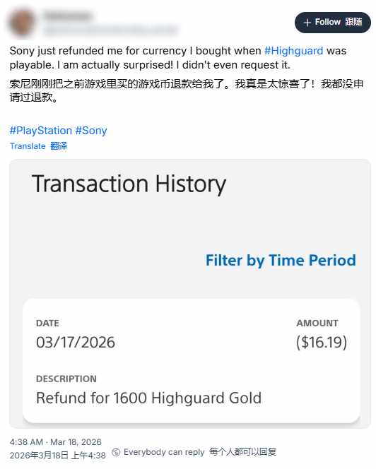 今天早些时候,Bluesky平台上有玩家分享了自己的经历,称索尼并未经过他们的申请,就主动将其在《巅峰守卫》中的内购消费退了回来。其中一位玩家表示:“索尼刚才把我之前游戏还能正常游玩时买的游戏货币退给我了,太意外了,我压根就没提交过退款申请。”还有一位玩家也透露:“看得出来索尼正在主动处理《巅峰守卫》的内购退款,我没有任何申请操作,今天却收到了59波兰兹罗提的退款。”