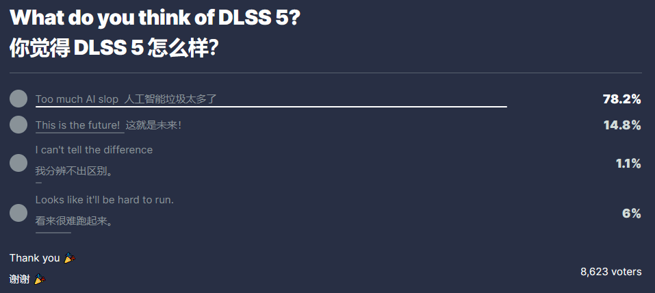针对这一技术的市场反馈,IGN通过调研收集了大量玩家观点,数据显示,在参与调研的8623名玩家中,78.2%的玩家对DLSS 5持否定态度,直言其“效果不佳”;仅有14.8%的玩家认可这项技术,认为其代表了游戏画面的未来发展方向。