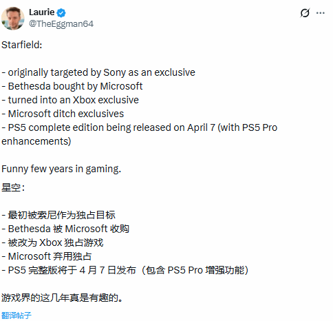 随着Bethesda正式宣布《星空》将于4月7日登陆PS5平台,一则关于Xbox收购B社初衷的旧帖再度引发热议。博主 @TheEggman64 发文回顾了这款作品命运的戏剧性转折,揭示了微软当年决策背后的深层原因。