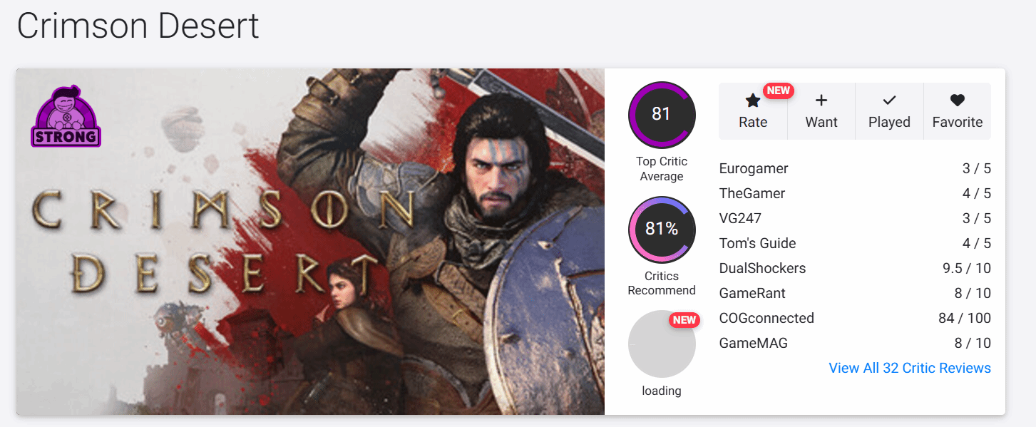 《红色沙漠》的媒体评价正式对外公布,OC站给出了81分的综合评分,媒体推荐率同样达到81%,成功斩获“Strong”(优秀)评价标签,整体表现处于上游水平,但也暴露了不少明显问题。