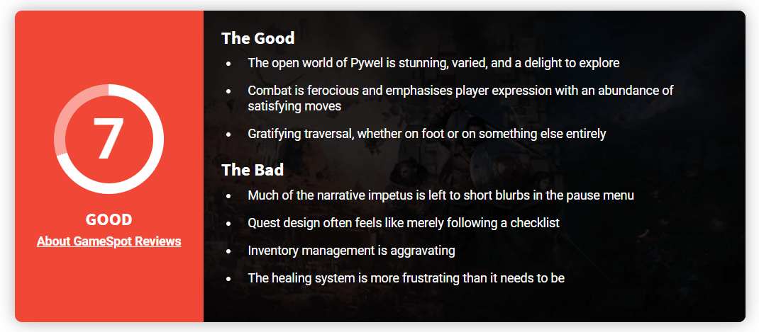 GS简评:游戏的开放世界壮丽夺目,战斗体验更是令人热血沸腾,表现十分出色,但部分叙事层面的问题以及易用性设计上的不足,成为了拉低整体体验的关键因素。