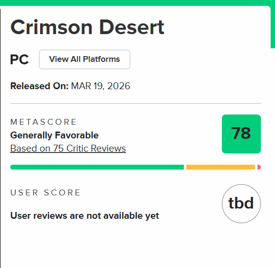 《红色沙漠》的媒体评价已正式解禁,随着评测数量的更新,该作在M站的评分也随之调整——目前收录75家媒体评测后,均分稳定在78分,相较于最初开分的79分略有回落,而不同媒体的评价差异明显,既有满分盛赞,也有低分批评,整体呈现两极分化态势。