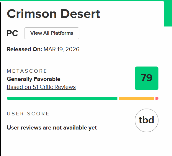 Critical Hits则给出了45分的低分,对游戏提出了较多批评,认为《红色沙漠》虽凭借宏大的开放世界冒险设定备受关注,但最终呈现的体验并未达到预期。该媒体表示,游戏叙事混乱、角色塑造平淡,任务设计如同平庸的网游任务;战斗系统虽机制繁多,但缺乏足够深度,还存在人为增加难度、操作响应迟缓等问题;即便拥有亮眼的画面和极高的探索自由度,但其在美术风格、Bug以及设计决策上的诸多问题,让这款游戏陷入了“内容庞大但品质浅薄”的困境。