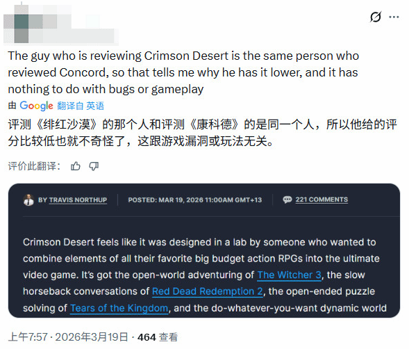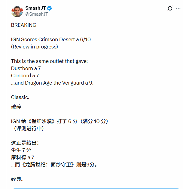此次舆论争议的核心,全程围绕IGN给出的6分评价展开。这一分数不仅与其他媒体给出的9.5分等高分差距悬殊,甚至低于此前口碑表现不佳的《星鸣特攻》《巅峰守卫》,不少玩家认为这一评分明显偏低,与游戏实际表现不符。更有网友留意到,负责为《红色沙漠》评分的编辑,和之前评测《星鸣特攻》的是同一人,这一发现也让玩家对该评分的客观性产生了更多怀疑。