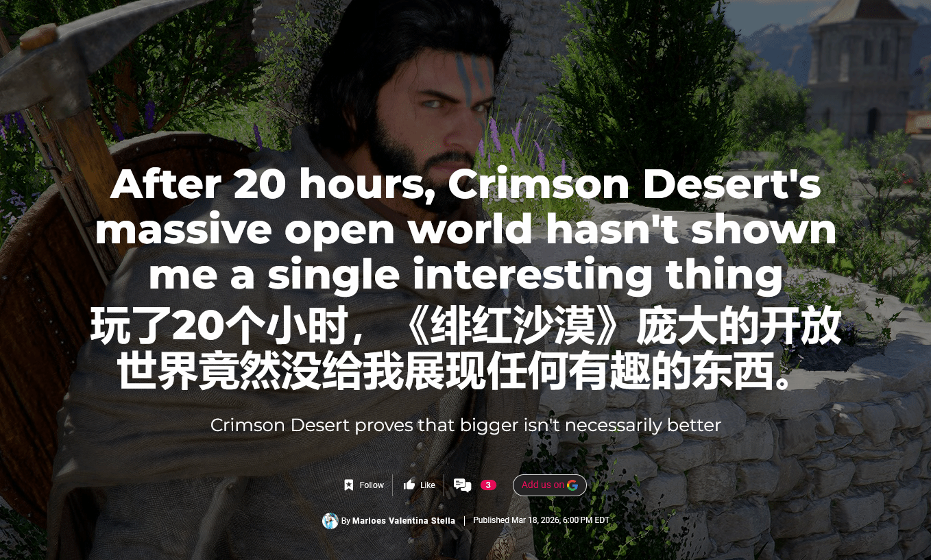 3月20日,韩国Pearl Abyss工作室打造的开放世界动作冒险游戏《红色沙漠》将正式登陆PC、PS5与XSX三大平台。就在发售前夕,评测渠道全面解禁,外媒Polygon率先发布评测报告,对这款备受关注的作品给出了负面评价,核心槽点集中在不合理的操作设计与乏味的开放世界,直言游戏体验难以让人坚持。以下是该评测的核心内容整理。