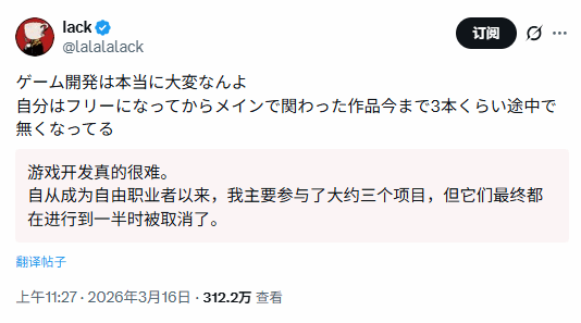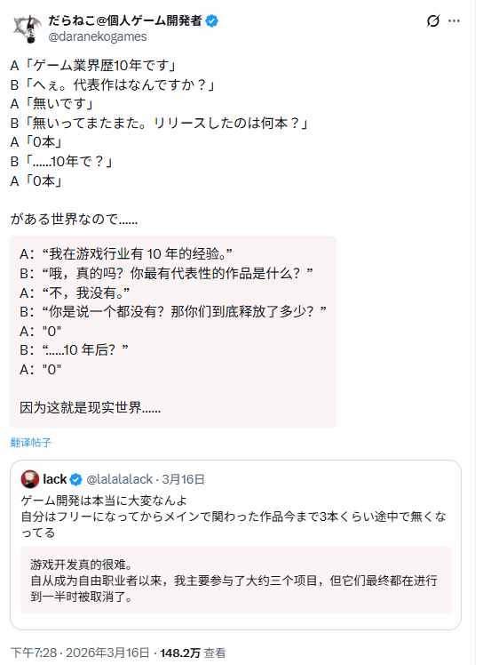 一位名为Daraneko的独立开发者表示,对于给公司打工的自由职业者来说,职业发展很看运气,“哪怕你再努力,项目发不出来,一切就等于零”。知名游戏制作人横尾太郎也坦言,自己这些年并非无所事事,而是一直在做项目,只是许多都中途被取消了。