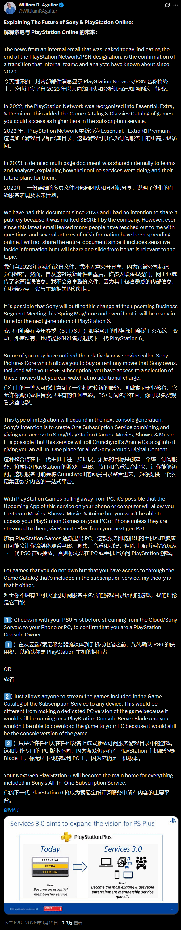 此前已有消息指出,索尼将逐步弃用“PlayStation Network”(PSN)的相关表述。Aguilar补充称,内部人士早在2023年便已知晓这一变动,公司可能会在今年5月或6月的会议上正式说明,并计划在PS6推出前完成过渡。
