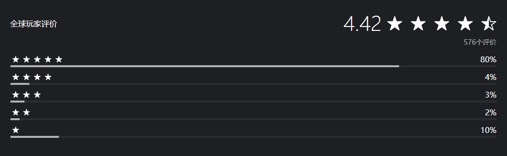 从玩家的评价分布情况来看,这款游戏的口碑呈现出极高的认可度,其中最值得关注的是,有80%的玩家为其打出了五分满分的评价,足以看出玩家对PS5版本《红色沙漠》的认可程度。