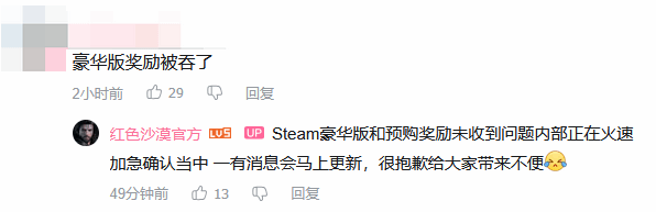 据悉,不少购买了该游戏豪华版的玩家,在游戏正式上线后发现,本该随豪华版附赠的专属奖励并未如期出现,一时间引发诸多玩家不满。不少玩家纷纷在游戏商店及官方社交平台留言反馈该问题,部分玩家更是因奖励缺失,对游戏给出了负面评价。