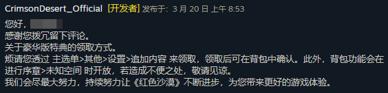 针对此次豪华版奖励发放异常的问题,《红色沙漠》制作组已第一时间作出回应。官方表示,目前正紧急核查奖励发放异常的相关情况,并给出了临时解决方案:玩家可先通过游戏内“主选单>其他>设置>追加内容”路径,检查奖励是否可正常领取;成功领取后,可在背包中查看相关奖励,不过背包功能需在游戏“序章>未知空间”阶段方可解锁。