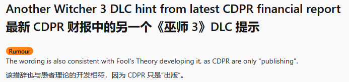 值得关注的是,CDPR在提及这款未公开游戏项目时,特意使用了“发行(publishing)”这一表述,这意味着该项目并非由CDPR内部团队直接研发。无独有偶,此前已有相关爆料称,传闻中的《巫师3:狂猎》新DLC,将由负责《巫师:重制版》开发的Fool's Theory工作室接手打造。CDPR财报中的这一细节,恰好与该爆料形成了呼应,也让不少玩家猜测,这正是在暗示《巫师3:狂猎》新DLC的存在。