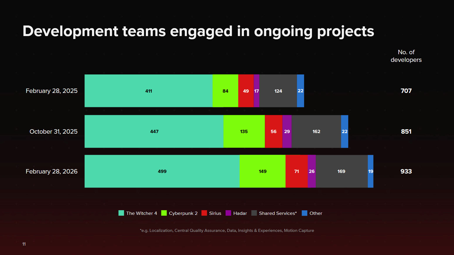 其他项目中,Project Sirius团队从56人增至71人,Project Hadar团队从29人缩减至26人;负责跨项目支持的共享服务团队有169人(此前162人),“其他”类别人员从22人减至19人。目前CDPR整体团队总人数已从162人增至933人。