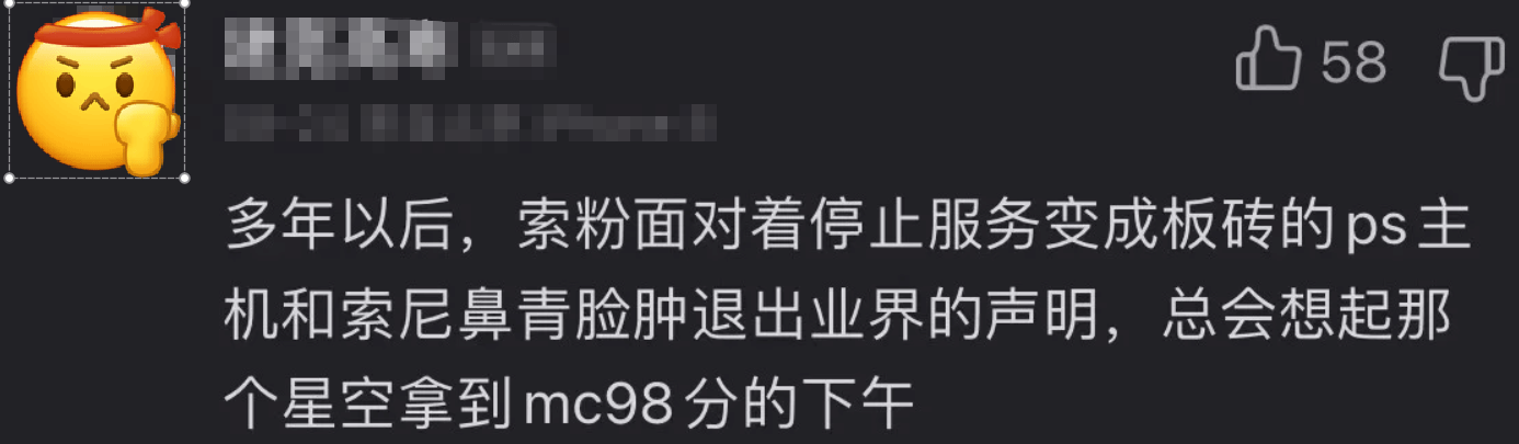 对于资深游戏玩家而言,“九八”这一数字背后的梗并不陌生。回溯至2023年《星空》首发之前,中文游戏圈曾流传着一段充满调侃意味的言论,一度引发热议:“多年以后,索粉面对着停止服务、沦为废机的PS主机,以及索尼狼狈退出游戏业界的声明,总会想起那个《星空》拿下MC 98分的下午。”