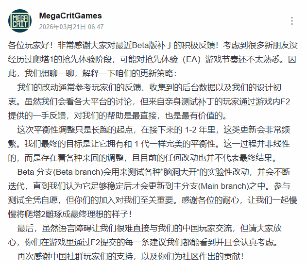 近期《杀戮尖塔2》Beta版补丁更新后,不少玩家给出差评,针对这一情况,游戏开发商MegaCritGames于2026年3月21日发布长文公告,不仅详细解读了游戏抢先体验(EA)阶段的更新思路,还专门回应了中国玩家的相关诉求,回应玩家们的各类关切。