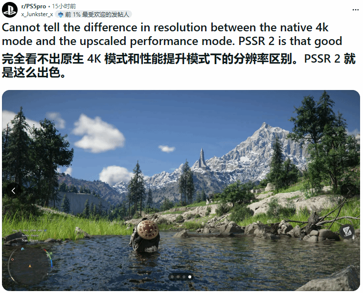 有玩家在国外PS5 Pro社区分享自己的游玩体验,直言自己完全分辨不出游戏原生4K模式与超分性能模式的分辨率差异。要知道,PSSR2作为索尼全新升级的AI画质增强技术,基于索尼与AMD合作的“紫水晶项目”打造,底层源自PC端的FSR 4技术,能通过AI逐帧分析,将低分辨率画面精准重建为高清画质,彻底解决了初代PSSR模糊、拖影的痛点,效果远超玩家预期。