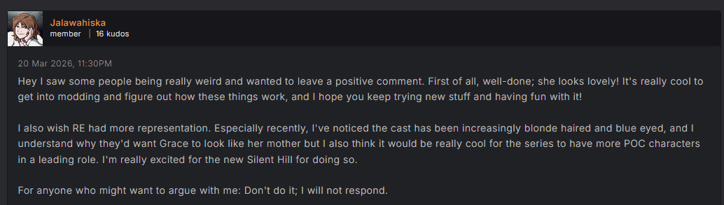 该MOD推出后,获得了不少玩家的支持。有玩家留言表达认可,称看到有部分人对这款MOD反应过激,希望留下正面评价,不仅称赞MOD制作精良、角色呈现效果出色,还鼓励作者继续探索、享受制作的乐趣。