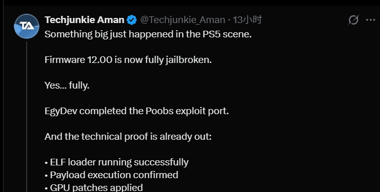 知名科技博主@Techjunkie Aman近日透露,软件工程师Moahmed Adel在PS5系统固件破解领域取得了关键性突破,成功将攻击范围推进至12.00版本。