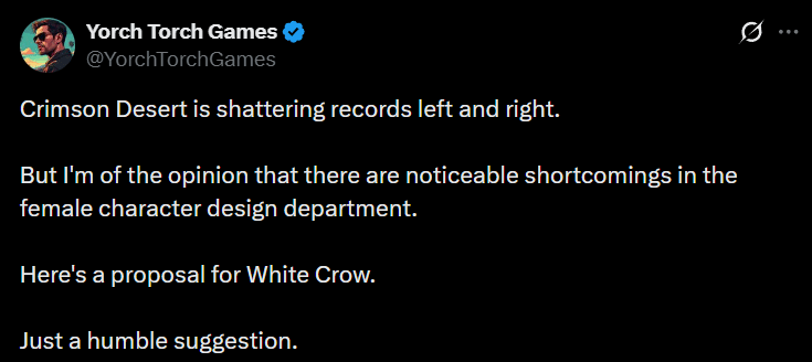这位名为YorchTorchGames的博主表示:“《红色沙漠》的销量还在不断刷新纪录,但我觉得它的女性角色设计有明显短板,这是我给‘白鸦’(White Crow)这个角色提的一点小建议。”同时,他还晒出了角色修改前后的对比图,左侧是游戏原版角色形象,右侧则是他调整后的版本——不仅更显性感,曲线也更为饱满,一眼看去,颇有《剑星》《第一后裔》等作品的熟悉画风。