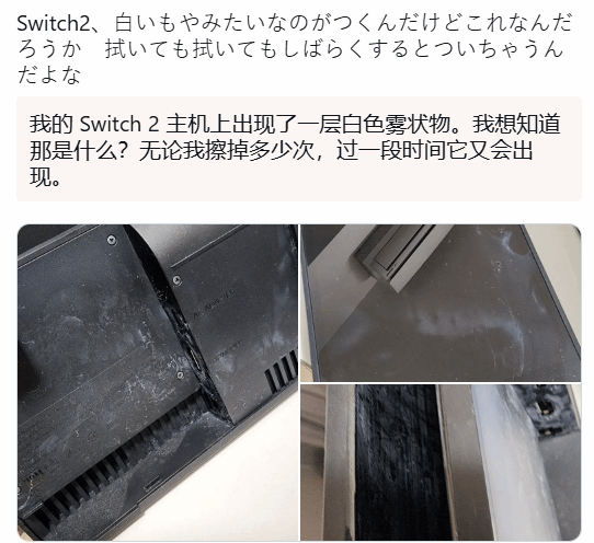 外媒blog.esuteru曾报道过这样一起案例:有玩家发现自己的Switch2机身表面,总是会出现一层白色粉末状物质。起初他以为只是普通灰尘,可每次清理干净后,没过多久粉末就会再次出现,这让他十分困惑。