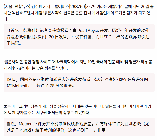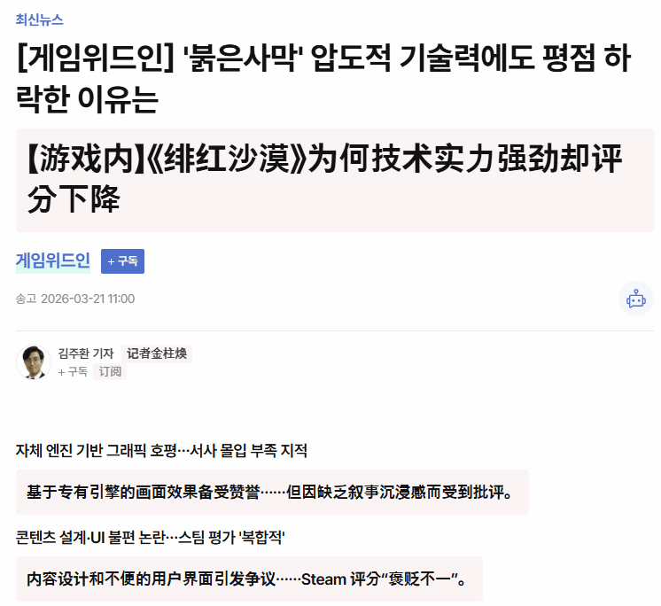 韩国媒体韩联社发表专题文章,聚焦《红色沙漠》评分偏低的问题,文章标题直指核心疑问:“技术实力出众,《红色沙漠》为何评分不尽如人意?”
