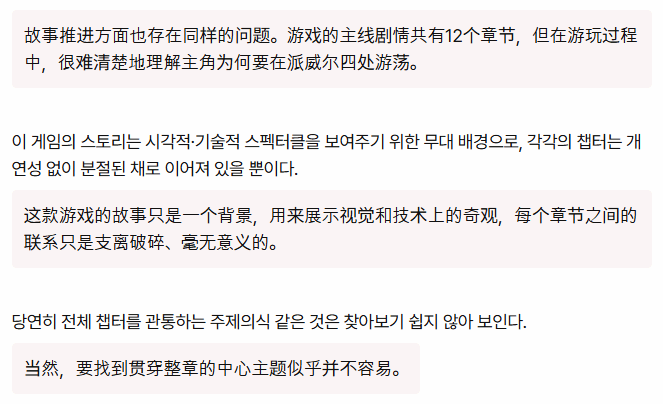 记者进一步吐槽,游戏的剧情设计同样拉胯,各个章节之间缺乏紧密关联,衔接松散杂乱,整体显得毫无逻辑、没有意义。