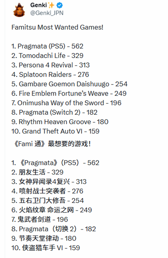 本次Famitsu最受期待游戏榜单完整排名如下: