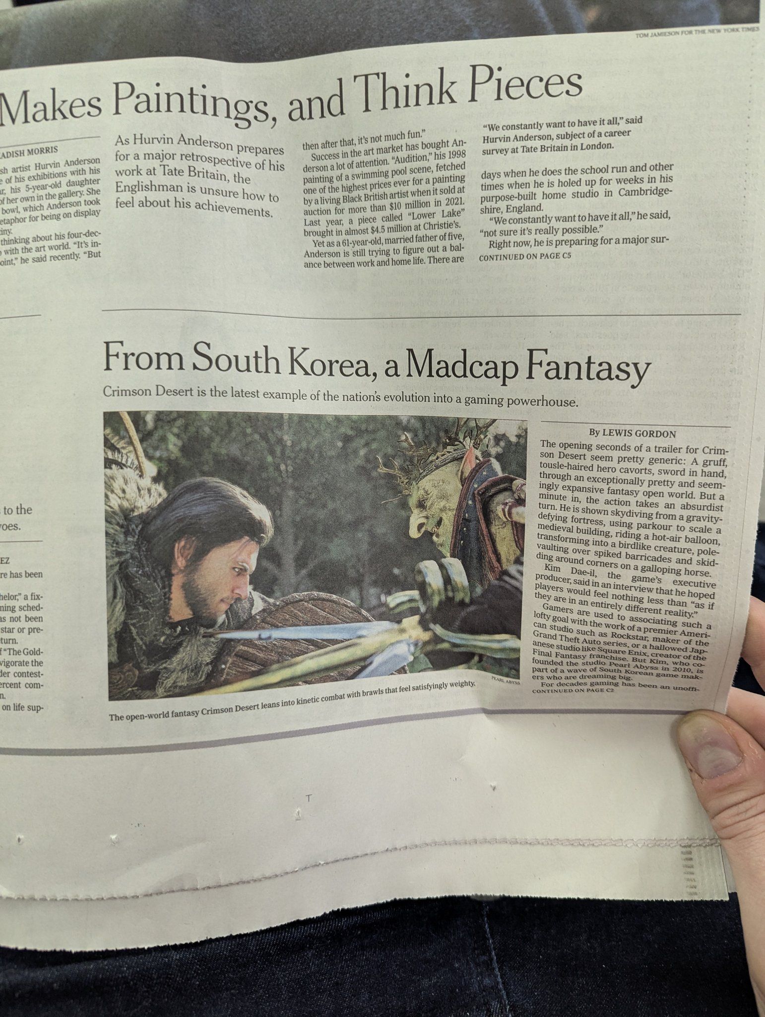 从Powers分享的实拍图来看,在最新一期《纽约时报》的“Arts”版块中,《红色沙漠》占据了极为醒目的版面。这篇特稿以“来自韩国,天马行空的幻想”为题,辅以大幅游戏彩图,视觉张力拉满。文章将本作视为韩国游戏产业从传统网游巨头向全球“游戏强国”转型的最新标杆,文中不仅细致描绘了游戏从经典奇幻开篇到各类打破常规的动作设计,更评价其构建了一种“截然不同的现实体验”。