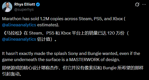 Rhyss Elliott还将该作与去年走红的同类型游戏《Arc Raiders》进行了对比,后者在今年年初时销量已突破1200万份。尽管两款游戏的发售时间有差异,但《失落星船:马拉松》的销售节奏仍明显落后——《Arc Raiders》发售一周内销量就预估达到160万份,而《失落星船:马拉松》发售至今已超过半个月,总销量才勉强达到120万份。