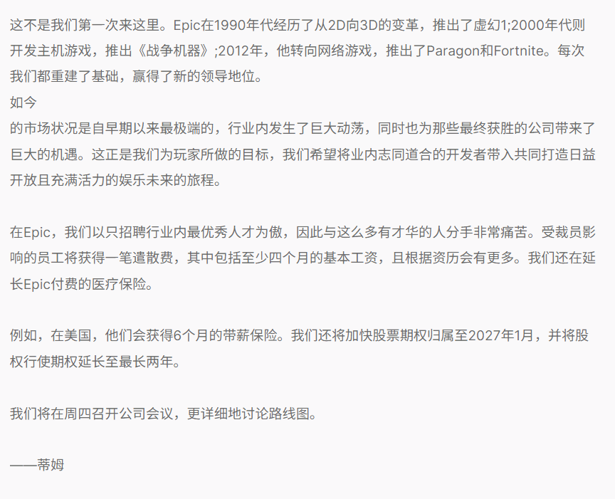 目前,Epic官方已对外公布此次裁员的相关公告,详细说明了裁员背景与目的。此次大规模裁员不仅影响到众多员工的就业,也让不少玩家对Epic的后续发展产生疑问,尤其是大家关心的免费游戏发放,后续是否会受到影响,仍有待进一步消息披露。