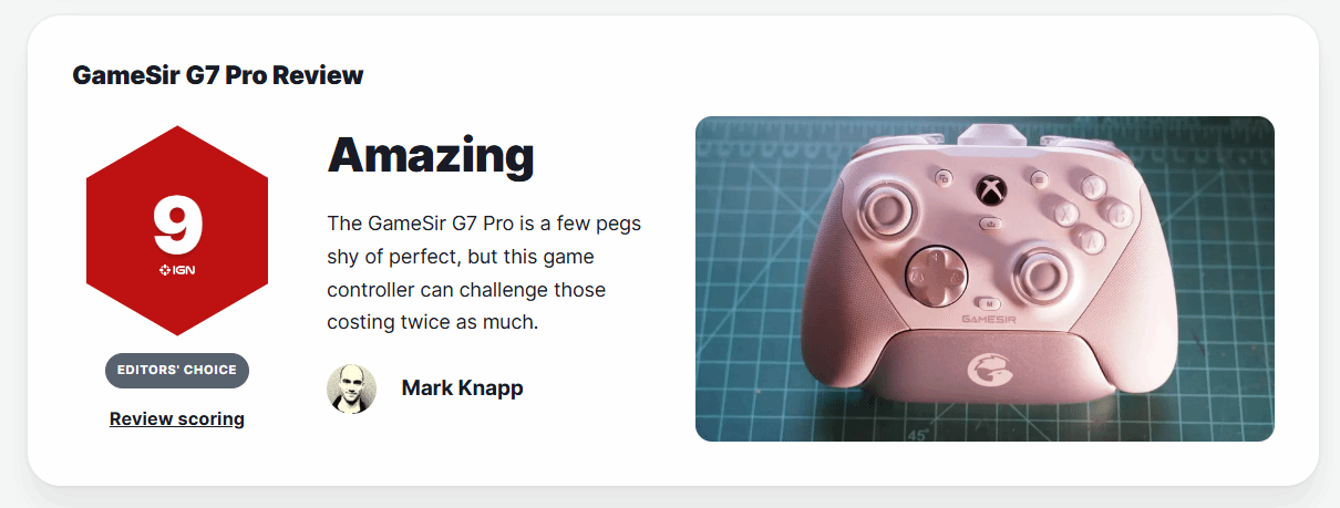 全球知名游戏媒体IGN发布了对国产游戏手柄GameSir G7 Pro的评测报告,为这款产品给出了9分的优异成绩,这一分数也成为国产手柄在该媒体评测中的高分代表之一。