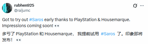 该创作者在分享中表达了感谢,称“十分感谢PlayStation和Housemarque给予的提前试玩机会,关于《沙罗周期》的详细体验感受,后续会尽快分享给大家”。
