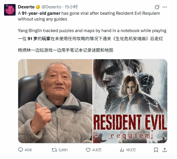 今年91岁的杨炳林,始终保持着对游戏的热爱,此次成功通关《生化危机9:安魂曲》后,其手写的游戏攻略也随之曝光,这份坚持与热忱打动了无数人。消息传到海外后,迅速引发关注,多家国外媒体纷纷对这位传奇老玩家进行报道,讲述他与游戏的故事。