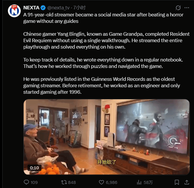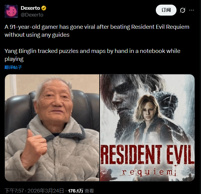 91岁的杨炳林近期凭借无攻略通关《生化危机9安魂曲》的表现,引发海外媒体广泛关注,这位被网友称作“游戏爷爷”的创作者,也凭借硬核的游戏操作圈粉无数。
