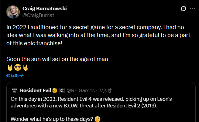这番看似平常的发言,很快被玩家捕捉到关键信息,迅速引发全网热议,不少人将其解读为克雷格·伯纳托夫斯基将参与《生化危机》新作的强烈暗示。