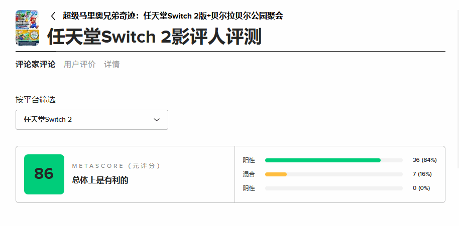目前已有多家评测平台给出了各自的评分,不同平台评价差异明显:Player 2给出满分100分,My Nintendo News给出90分,而Nintendo Life则给出60分,所有评测均基于NS2平台。