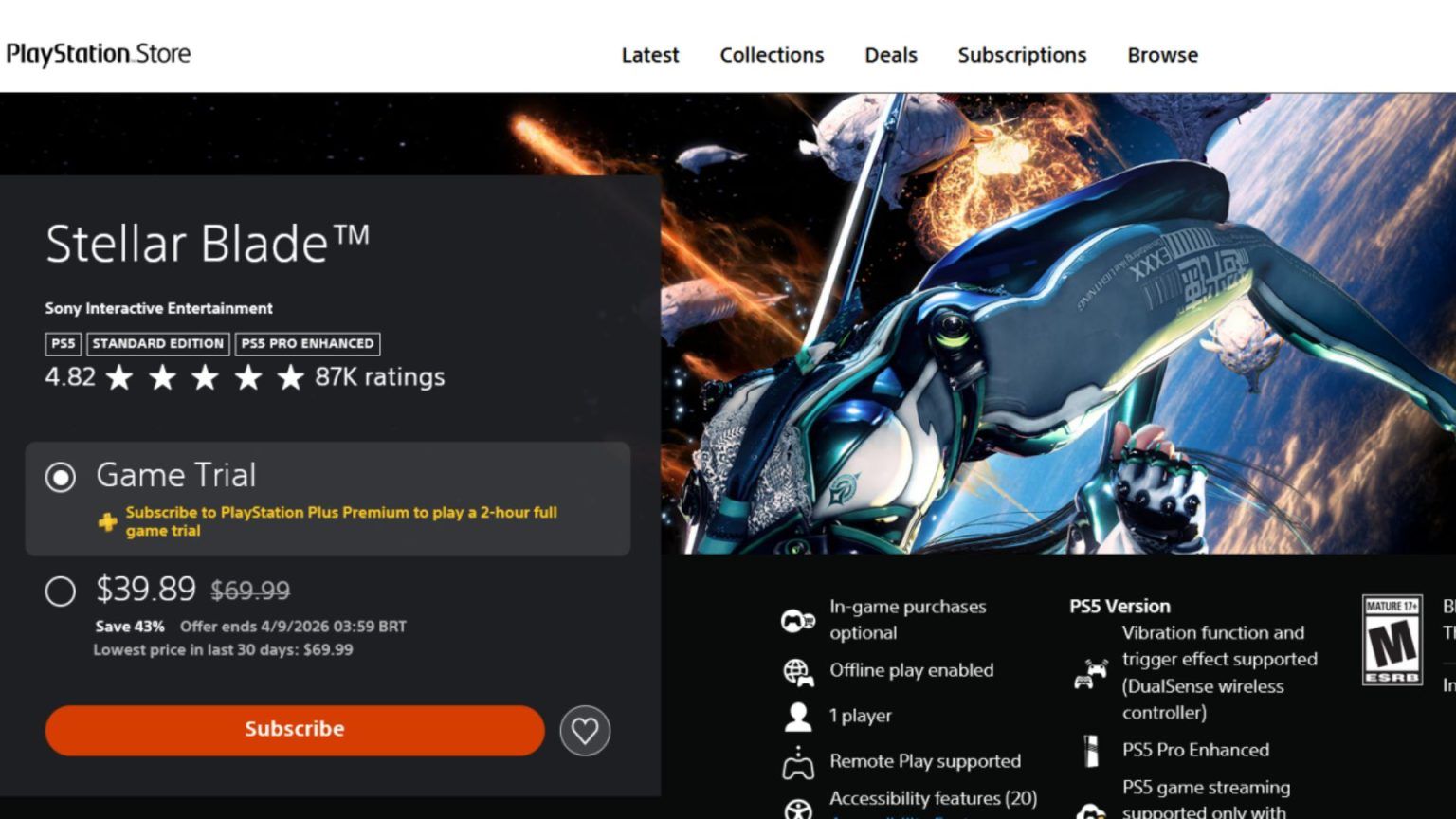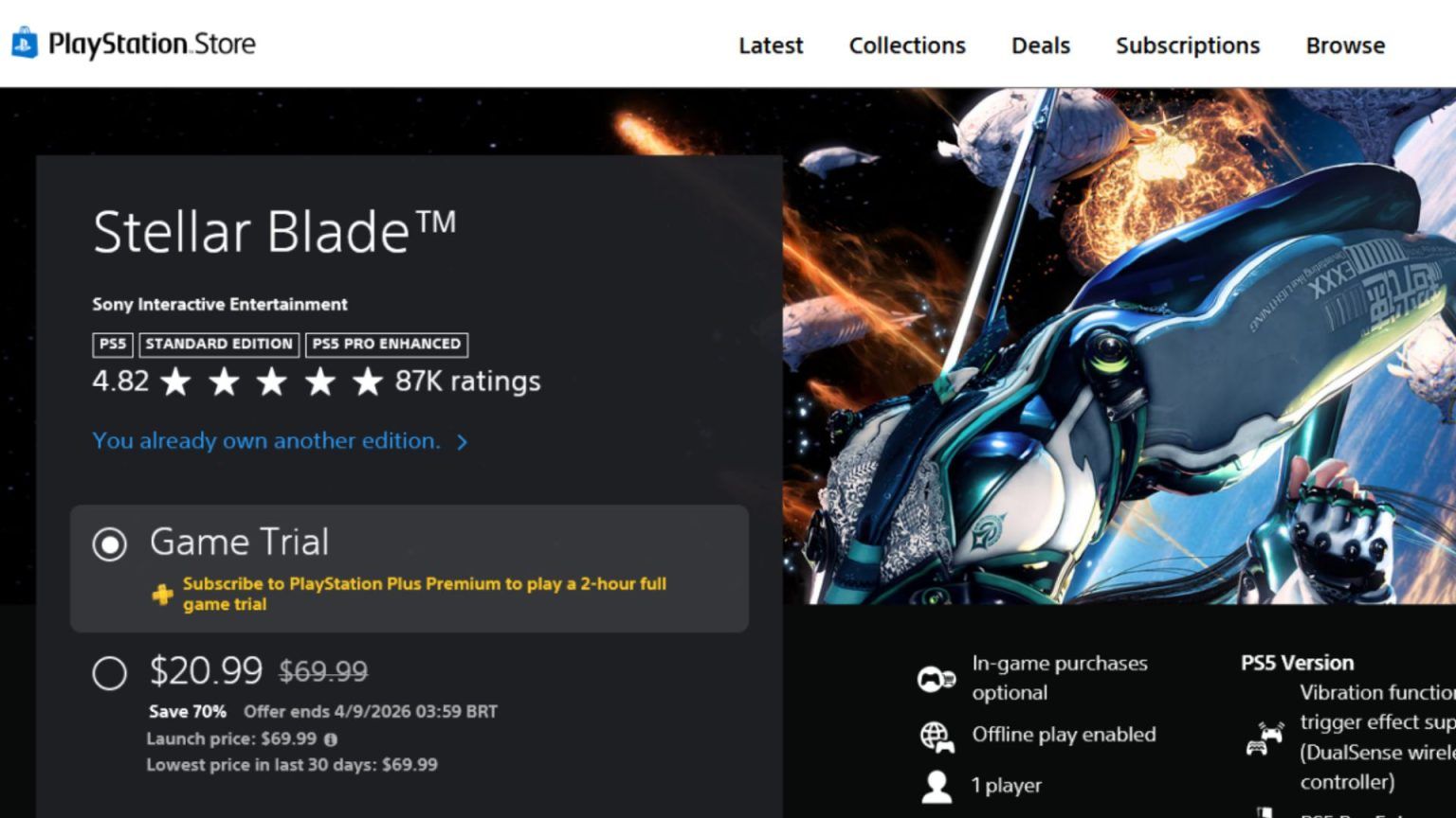 有一位Insider Gaming的编辑,就被索尼纳入了动态定价测试用户范围。以原价69.99美元的《剑星》为例,在常规优惠力度下,折扣率为43%,入手价需要39.89美元,这也是多数测试用户能享受到的正常优惠。