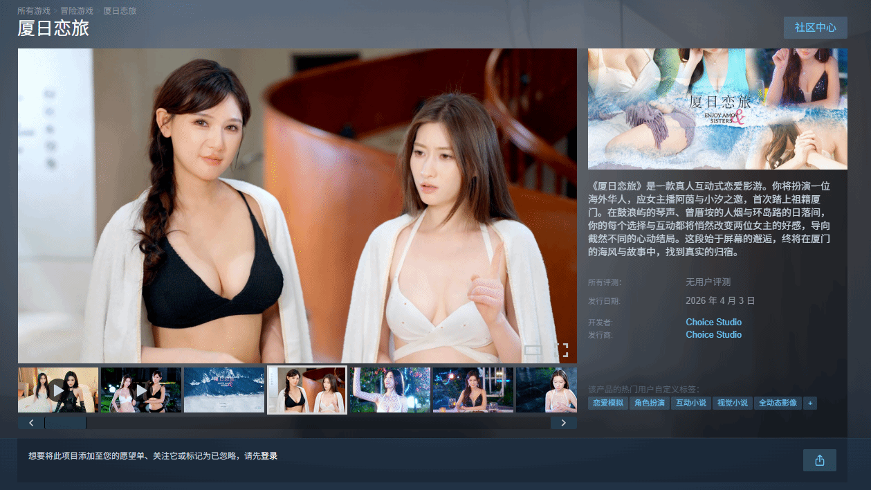 由模特冠军泳装大雷出演的真人互动式恋爱影游《厦日恋旅》,确认将于4月3日登陆Steam平台正式发售。这款游戏曾因尺度问题被下架,此次重新定档发售,也引发了不少玩家与网友的关注。