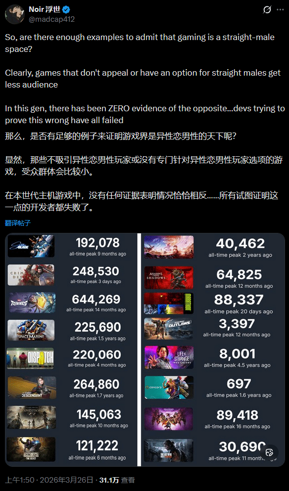 游戏博主@madcap412发布推文,抛出了一个引发广泛讨论的观点:游戏领域依旧是异性恋男性玩家主导的空间。他在推文中进一步解释,那些不迎合、不向异性恋男性提供适配选择的游戏,受众往往会少很多,而这一世代里,几乎没有相反的案例能推翻这一结论,那些试图证明“游戏不只是直男天下”的开发者,最终都以失败告终。